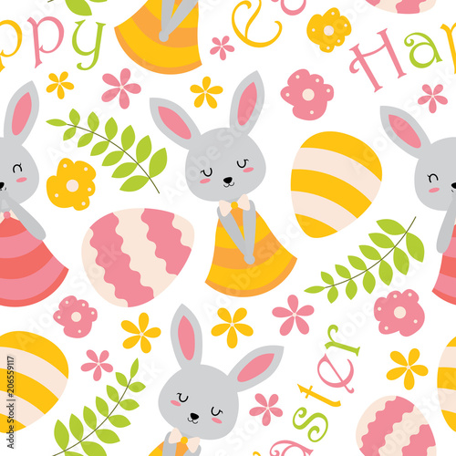 Seamless Pattern With Cute Bunny Flowers And Eggs Vector Cartoon